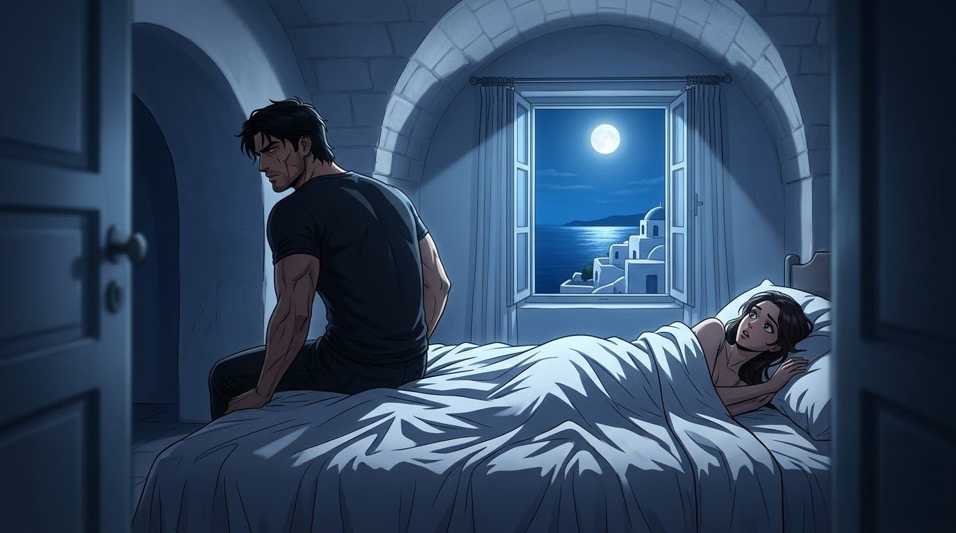 Santorini at midnight is a dream painted in shadows and silver. The white-washed walls of the villa glow under the Aegean moon, but I can’t appreciate the beauty. Not when my heart is drumming a frantic rhythm, and the man standing behind me feels like a storm waiting to break.