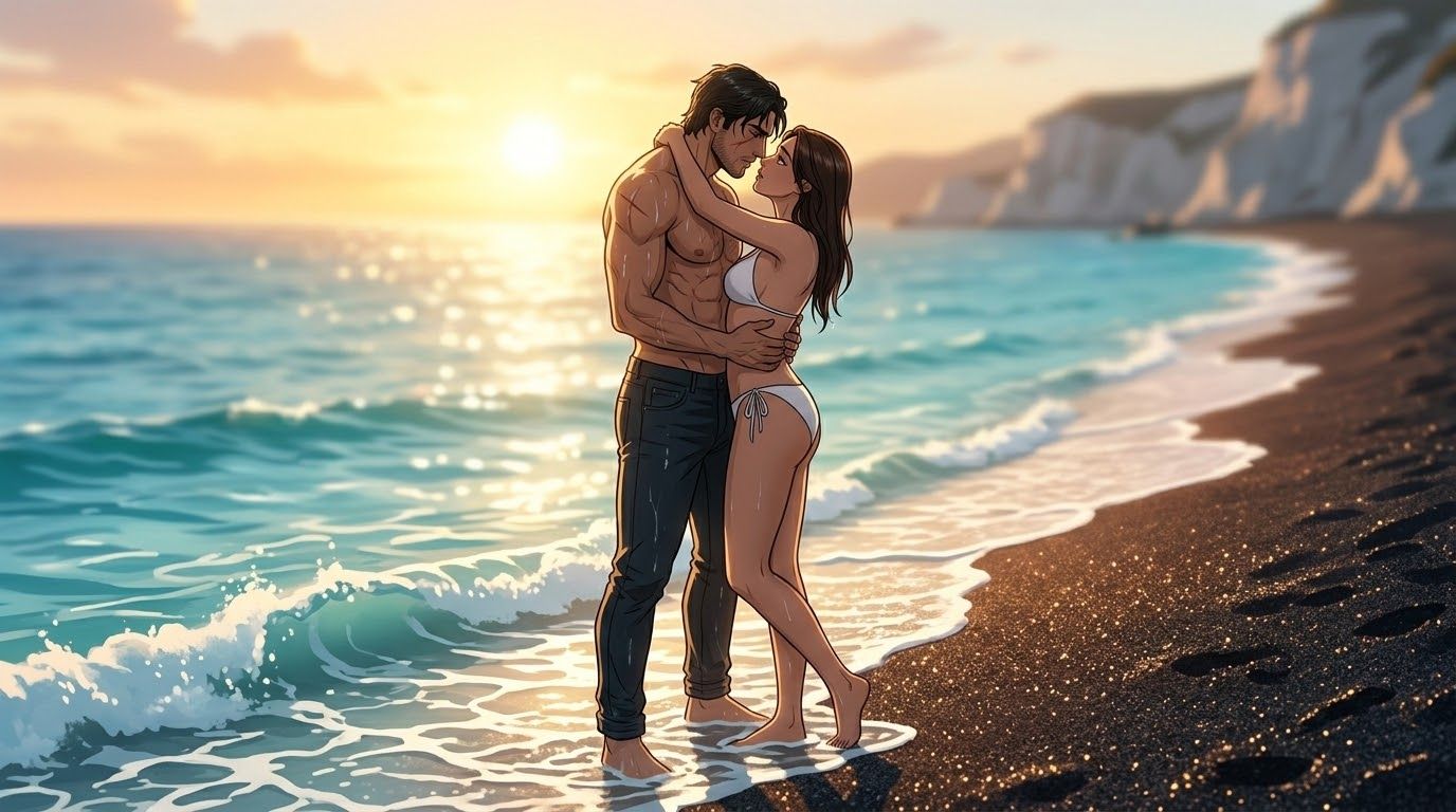 The kiss is an explosion. It tastes of salt, heat, and years of suppressed longing. He lifts me out of the water, my legs wrapping around his waist. He lays me back onto the black shore, his body shielding mine. "If they kill me today, Lyra," he gasps, "know that this was worth it." But as his lips find my throat, I see a flash of metal on the cliffs above. A lens. We aren't alone.